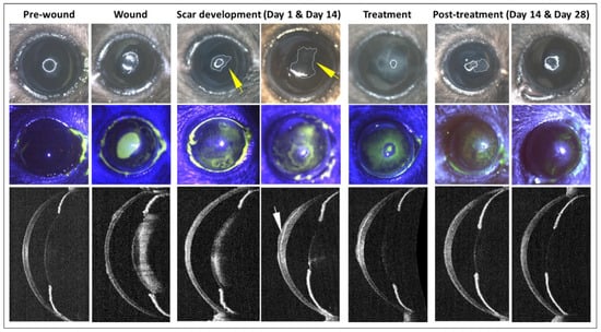 A clinical assessment of both eyes was undertaken before and after the debridement and treatment of the corneas. Clinical photographs of the ocular surface and optical coherence tomography (OCT) scans of the corneal ultrastructure were taken to detect the changes in the reflectivity and thickness of the corneal layers. Additionally, fluorescein staining of the ocular surface was performed to track the wound closure and reepithelization of the corneas debrided. The assessment was conducted at the stages of the pre-wound, wound, pre-op (on days 1, 7, and 14 during the development of the scar), and post-op stages (days 7, 14, 21, and 28).