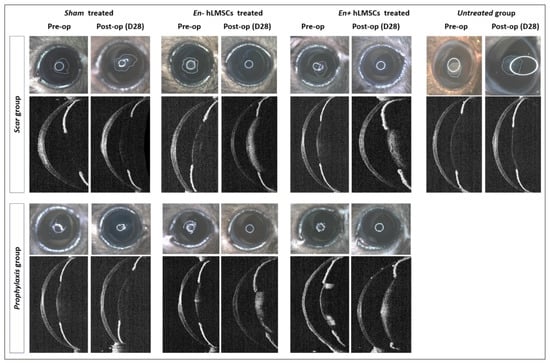 Outcomes of the treatment with hLMSCs: Collage of representative microphotographs and scans showing the scarring of debrided corneas before and after treatment with hLMSCs. Eyes of the untreated and sham treated arms show the unhealed corneas post debridement/treatment. Eyes treated with En−/En+ hLMSCs showed relatively clear corneas with less haze and scarring.