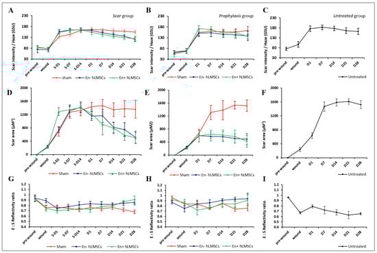 While the eyes that received En−/En+ hLMSCs were able to normalize to the baseline E:S ratio in all of the treated arms (Figure 5G,H), this ratio was found to gradually de-crease in the untreated (0.96 ± 0.01 to 0.65 ± 0.02) or sham-treated arms (scar: 0.93 ± 0.04 to 0.68 ± 01 and prophylaxis: 0.96 ± 0.01 to 0.76 ± 0.1) in all of the groups, indicating the elevated stromal reflectivity (Figure 5I).