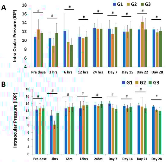 The cornea, conjunctiva, iris, and aqueous humor were all examined using slit lamps (PSLAIA-11, Appasamy Associates, Chennai, TN, India). For corneal and conjunctival ophthalmic examinations, fluorescein ophthalmic strips were utilized. The ophthalmic observations were rated utilizing a numerical scoring procedure outlined in the OECD chemical testing guidelines, Test 405 “Scoring of the Lesions on Ocular surface” [28] and in accordance with Schedule Y [31] Before dosing, slit lamp and IOP readings were taken as well as at 3, 6, 12, and 24 h on day 1, and on days 7, 14, 21, and 28 after dosing. Supplementary Table S1 outlines the scoring guidelines.