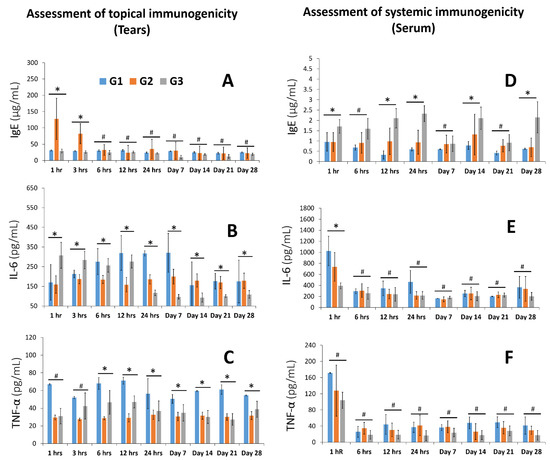 Serum and tear levels of IgE, IL-6, and TNF-α after treatment with En+/En− hLMSCs in rabbits. (A–C) Bar charts displaying the ELISA-determined concentrations of the cytokines IgE, IL-6, and TNF-α in rabbit serum. (D–F) Quantitative analysis of rabbit tear samples for the cytokines interleukin (IL)-6, tumor necrosis factor α, and interleukin (IL)-1 presented as bar graphs. Both the experimental and control groups showed a downward trend in cytokine levels, suggesting that there was no localized toxicity in the eyes of the recipients. * p ≤ 0.05; # p > 0.05. G1—Sham treated group; G2—Treated with En− hLMSCs; G3—Treated with En+ hLMSCs.