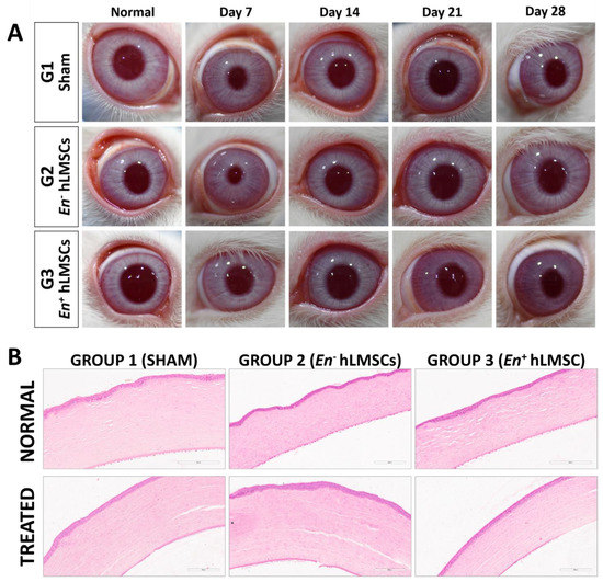 Rabbit eyes and corneal histopathology after En+/En− hLMSC treatment. (A) Clinical photographs of normal and injured rabbit eyes taken over a 28-day period showed no evidence of inflammation or irritation in the injured eyes. The Nikon D7200 and Nikon AF-S VR Micro-NIKKOR 105 mm f/2.8 G IF-ED lens were used to take the images. (B) Histopathological sections of normal and treated corneas represented by a panel of representative photomicrographs. Magnification: 40×; Scale: 200 µM. Group 1 received no treatment (sham group); Group 2 received En−hLMSCs; and Group 3 received En+ hLMSCs.