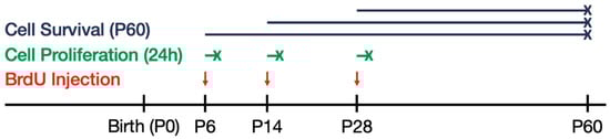 3.1. Cell Proliferation in Mice Injected on P6, P14, and P28