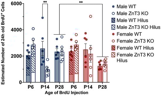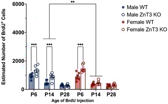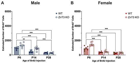 Given that the rate of neurogenesis changes across multiple stages of the lifespan [,], we were also interested in examining whether there were any effects of the age at which BrdU was administered on cell proliferation. To do this, we conducted a two-way ANOVA to compare the number of BrdU+ cells between WT and ZnT3 KO mice injected on P6, P14, and P28. A separate ANOVA was run for each sex (male and female) given the previous sex difference found in the cell proliferation (Supplementary Table S2).