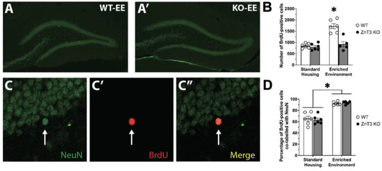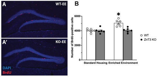 Cell proliferation in the hippocampus of WT and ZnT3 KO mice exposed to SH or EE (n = 24). Representative photomicrographs of DAPI (blue) and BrdU-immunopositive cells (red) in the subgranular zone of a (A) WT and (A’) ZnT3 KO mouse housed in EE. (B) The levels of cell proliferation seen in WT and ZnT3 KO mice placed in the SH condition did not differ. However, while WT mice in EE showed a significant increase in cell proliferation, the level of proliferation in ZnT3 KO-EE mice was significantly lower and was no different from levels in WT and ZnT3 KO mice in the SH condition. Error bars represent ± standard error of the mean. * indicates p < 0.001.