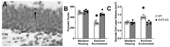 Interestingly, we found that the volume of the granule cell layer was increased in WT mice exposed to EE but not in ZnT3 KO mice, suggesting that vesicular zinc may also be necessary for EE-induced increases in granule cell layer volume. Enrichment has previously been shown to increase granule cell layer volume, with one study reporting that environmental enrichment increased the granule cell layer volume by 15% [21]. Wheel running has also been shown to increase the volume of the granule cell layer [65,66].