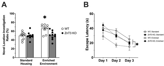 3.3. Mice Lacking Vesicular Zinc Show No Improvement in Spatial Memory following Environmental Enrichment