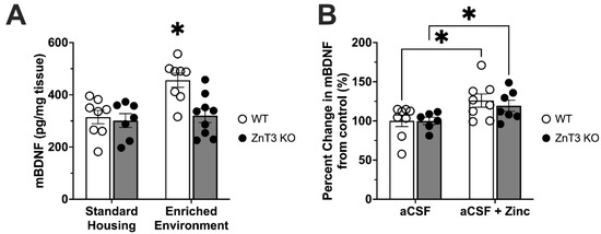 To examine if ZnT3 KO mice were able to increase BDNF levels in response to zinc stimulation, we bypassed the inability of vesicular zinc to be released by exposing hippocampal slices from WT and ZnT3 KO mice to 10 µM Zn. An independent samples t-test found that the application of zinc significantly increased levels of mature BDNF in the hippocampus of both WT and ZnT3 KO mice when compared to their respective control groups [WT-Zn vs. WT: t(14) = 2.33, p = 0.018; ZnT3 KO-Zn vs. ZnT3 KO: t(11) = 2.19, p = 0.025] (Figure 5B).