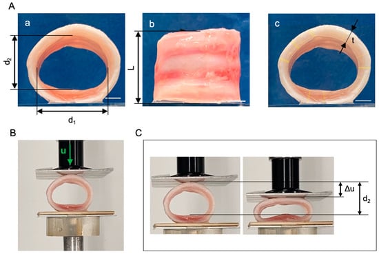(A) Ring-like sample of trachea for mechanical testing, with measurements of the medio-lateral (d1) and proximal-distal (d2) diameters (a), the length of the segment L (b) and the tracheal wall thickness t (c). Yellow segments refer to the shortest distance between the inner and outer outline of the sample section in 30 random points. Scale bars = 5 mm. (B) Experimental set-up for compression tests with trachea sample between two flat plates. The displacement Δu of the upper plate is applied along the distal-proximal direction. (C) Undeformed and deformed trachea samples with reference to the plate displacement Δu and the initial diameter d2.