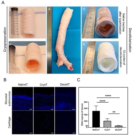 (A) Cryopreserved and decellularized pig trachea gross appearance. Soon after isolation (a) pig tracheas were divided into segments which underwent cryopreservation (b,c) and decellularization (d,e). Gross appearance of cryopreserved trachea segment (b,c); gross appearance of native tracheal segment after lyophilization (d); gross appearance of pig trachea after 12 decellularization cycles (e). (B) DAPI staining representative image of native (NativeT), cryopreserved (CryoT) and decellularized (DecellT) pig trachea. Blue dots (not detected in DecellT) correspond to cell nuclei. The presence of a diffused blue staining in the DecellT refers to extracellular matrix autofluorescence; autofluorescence was also detected in the Native T and CryoT samples. Scale bars = 100 μm. (C) Quantification of residual DNA into CryoT and DecellT samples versus the NativeT group (**: p < 0.01; ****: p < 0.0001).