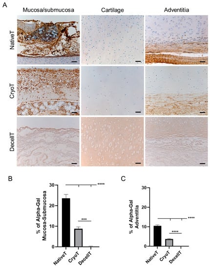 (A) Immunolocalization of Alpha-Gal epitopes in cryopreserved (CryoT) and decellularized (DecellT) samples versus native trachea (NativeT) (control). The mucosa/submucosa, cartilage and adventitia were considered separately. Positive elements are stained in brown. Scale bars: 50 µm. (B,C) Quantification of Alpha-Gal positive elements within the mucosa–submucosa and adventitia. (***: p < 0.001; ****: p < 0.0001).