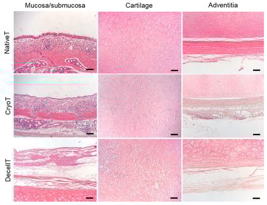Histological appearance of pig tracheas obtained by cryopreservation (CryoT) and decellularization (DecellT) compared with native trachea (NativeT) showed by haematoxylin and eosin (H&E) staining. The whole tissue thickness was considered, highlighting the microscopic organization of the mucosa/submucosa, cartilage and adventitia. Scale bars = 100 μm.