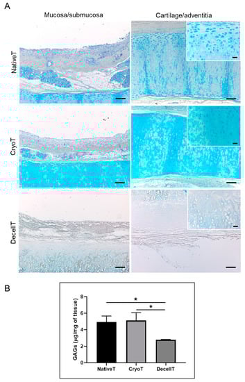 (A) Histological appearance of pig tracheas obtained by cryopreservation (CryoT) and decellularization (DecellT) compared with native trachea (NativeT) showed by Alcian Blue staining. The whole tissue thickness was considered. Scale bars: 100 µm (mucosa/submucosa); 50 µm (cartilage/adventitia); 200 µm (cartilage/adventitia, insert). (B) Sulphated glycosaminoglycans (GAGs) quantification, showing a reduction in GAGs content after decellularization (DecellT) compared with cryopreserved tracheas (CryoT) and native tracheas (NativeT) (*: p < 0.05).
