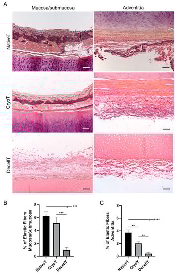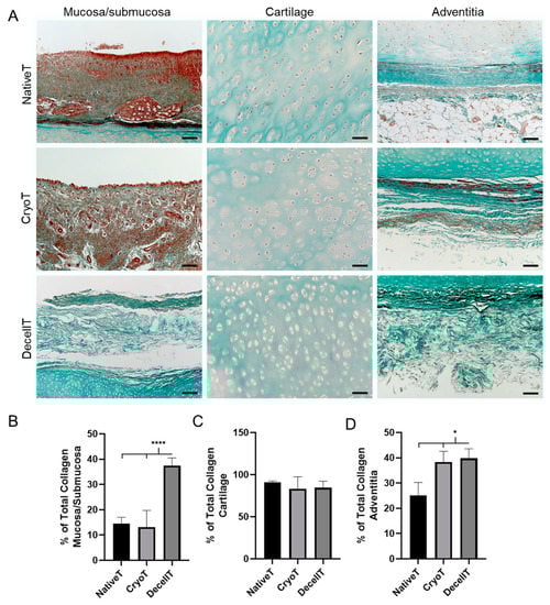 Collagen content was evaluated through different histological characterization studies. After Masson’s trichrome staining (Figure 6A), the mucosa/submucosa, the cartilage compartment and the adventitia were focused and quantification analysis was performed (Figure 6B–D). The green staining colour was uniformly represented, suggesting the presence of a broadly distributed collagen component in the hyaline cartilage. This evidence was also confirmed by green intensity quantification: the calculated mean values were 90.71 ± 1.79% for NativeT; 83.27 ± 14.30% for CryoT and 84.41 ± 7.95% for DecellT. No statistically significant differences were detected (Figure 6C). Differently, statistically higher values in total collagen were calculated for the mucosa/submucosa compartment and the adventitia in the DecellT group versus the other two groups (mucosa/submucosa: DecellT: 37.48 ± 2.99%; NativeT: 14.44 ± 2.59%; CryoT: 13.12 ± 6.61% (p < 0.0001). Adventitia: DecellT: 39.83 ± 3.73%; CryoT: 38.37 ± 4.18%; NativeT: 25.07 ± 5.23% (p < 0.05)) (Figure 6B,D).