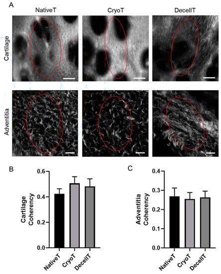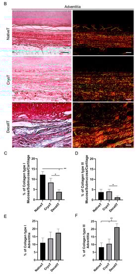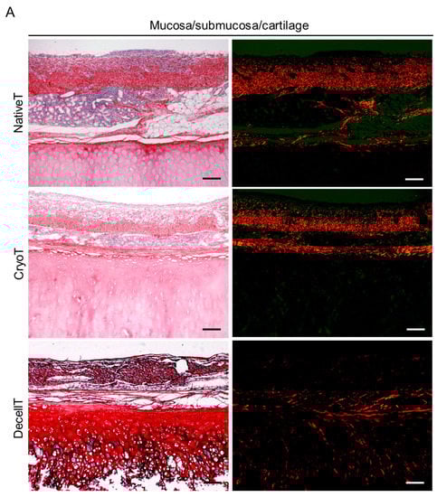 Contextually, Picrosirius Red staining allowed to specifically detect collagen type I (orange-red) and type III (green) fibers under polarized light. Specifically, bifringence allowed to recognize a broad collagen type I presence (larger fibers) in both the mucosa/submucosa and perichondrium for the NativeT and CryoT groups; conversely, the DecellT samples displayed collagen type I fibers at the perichondrium but also within the cartilagineous compartment, at the level of the territorial matrix. Collagen type III (thinner fibers) was nearly not identifiable here (Figure 7A).