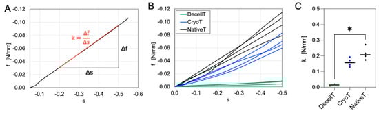 Compression tests were carried out with Bose ElectroForce® Planar Biaxial Test Bench instrument (TA Instruments, New Castle, DE, USA) under displacement control, with a load cell of 22 N. Two flat plates were positioned parallel to each other (Figure 1C): samples were placed on the lower plate, leaning on the posterior tracheal wall, while the upper plate was gradually approached at a constant rate of 0.2 mm s−1. Samples were compressed up to reducing of 50% the initial proximal-distal diameter. Tracheal compressive deformation s in the proximal–distal direction was measured as the ratio of the plate displacement Δu and the initial diameter d2 (Figure 1D). To compare tracheal samples of different sizes, the force per unit of length of the sample f (in N mm−1) was calculated as the ratio between the force value F measured by the load cell and the sample length L. The stiffness of the sample was estimated by considering the secant compressive modulus k, calculated as the slope of the straight line drawn from the experimental data at 20% and 50% compressive deformation. The values of the secant compressive modulus k were analyzed through Kruskal–Wallis nonparametric one-way Analysis of Variance (ANOVA) and post hoc comparison, considering as significant a p-value lower than 0.05.
