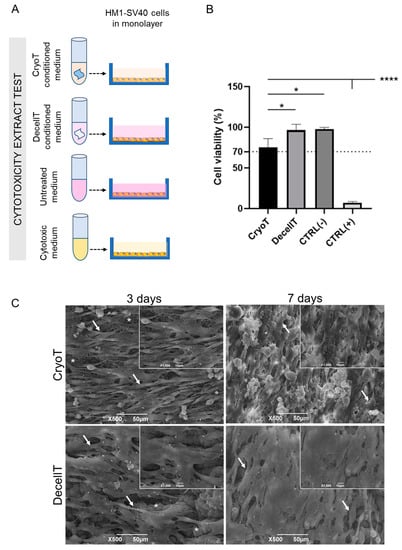 Preliminarily, to obtain the tissue extracts, a weighted amount (400 mg) of decontaminated cryopreserved and decellularized tracheal samples were incubated in the HM1-SV40 cell proliferation medium (1 mL of medium/100 mg of tissue) consisting in Alpha-Modified Eagle Medium (α-MEM) (ThermoFisher Scientific), 16.5% of fetal bovine serum (FBS) (ThermoFisher Scientific), 1% glutamine (Merck Lifescience) and 1% penicillin/streptomycin solution (100 mg/mL) (Merck Lifescience). Incubation lasted 72 h at 37 °C (5% CO2 and 95% humidity).