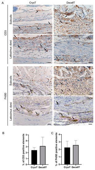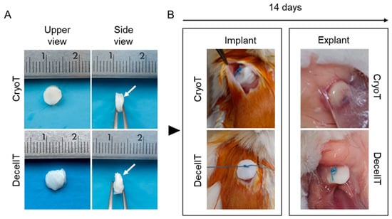 In vivo biocompatibility assay was performed implanting pig CryoT and DecellT samples in a subcutaneous pouch of Balb/C mice (International Organization for Standardization (ISO) 996-3) [55]. Animal surgery and husbandry were performed in accordance with the Italian guidelines on the use of experimental animals (DL n. 16/92 art. 5) and approved by the Ethical Committee of the University of Padova and by the Italian Department of Health (Authorisation n. 1076/2020-PR, 10 November 2020).