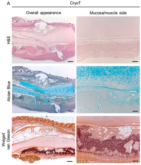 Within each group, the glands secretory cells and the ECM were characterized by Alcian Blue staining showing cytoplasmic granules and GAGs presence, respectively. NativeT and CryoT samples displayed a similar blue staining. Conversely, a less intense blue colour was detected in the DecellT samples, suggesting glands’ modification and a certain GAGs depletion in cartilage ECM (Figure 5A). Typically, in the cartilaginous compartment, GAGs are mainly located in the territorial matrix: this was evident observing NativeT and CryoT samples. In accordance with preliminary H&E, DecellT territorial matrix was only faintly blue colored compared with the other experimental groups.