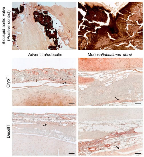 Histological analyses including H&E, Masson’s Trichrome, Sirius Red, Alcian-blue and Weigert Van Gieson staining were accomplished as previously reported to verify eventual ECM remodeling after in vivo implant. In addition, von Kossa staining was also included to establish a possible contribution of cryopreservation and decellularization to calcification of the specimens after implant. Briefly, re-hydrated sections were flooded with 5% of aqueous silver nitrate; hence they were exposed to sunlight for 20 min prior to be washed well in distilled water. The samples were than treated with 2% sodium thiosulphate for 2 min, washed in running tap water, rinsed in distilled water and counterstained with 1% Neutral red for 2 min. After a rapid dehydration, the slides were cleared in xylene prior to be mounted with Eukitt.