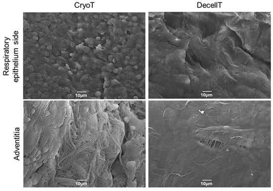 Despite both being appealing, consensus over the optimal strategy is still lacking [37]. Several knowledge gaps exist about the effects of cryopreservation and thawing on tracheal tissue cell viability, immunogenicity, and extracellular matrix features [38]; furthermore, recurring to decellularization methods gives rise to several questions mainly related to ECM features and ultrastructural modification descending from the impact of potential “aggressive” protocols towards ultrastructure integrity. Hence, the aim of this study was to develop and describe pig-derived tracheal grafts obtained by cryopreservation and decellularization for a close comparison over tissue structural and ultrastructural features, ECM characteristics, eventual cytotoxicity descending from the preparation protocols, and biocompatibility in vivo. The results can be predictive for device outcomes after orthotopic implantation.