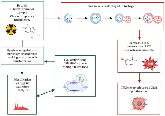 MGMT promoter methylation is an important predictive marker when evaluating the efficacy of therapy with TMZ; however, a more recent investigation has revealed other mechanisms that can confer therapeutic resistance, such as an increase in drug efflux and activation of cytoprotective autophagy []. Autophagy is a cellular homeostatic process that involves the degradation and recycling of intracellular components, such as faulty proteins and organelles, via the use of lysosomes, generating cellular building blocks that can then be recycled in metabolic and biosynthetic pathways. Although present in all cells at basal levels, autophagy is commonly upregulated in the context of cancer to mitigate the effects of stressors such as nutrient deprivation, hypoxia, accumulation of reactive oxygen species (ROS), and cellular damage due to chemotherapy [].