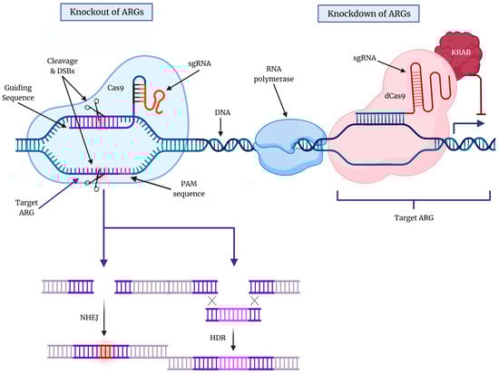 An overview of the CRISPR-Cas9 gene editing technology. The ever-evolving CRISPR-Cas9 gene editing technology has enabled the knockout (KO) and knockdown (KD) of specific genes that are known to promote cytoprotective autophagy in cancers. The protospacer adjacent motif (PAM) sequence and sgRNA are essential for DNA target recognition. The double-strand breaks (DSBs) that result from CRISPR-Cas9 action can lead to either non-homologous end joining (NHEJ) or homology-directed repair (HDR) in the DNA molecule. KO typically involves NHEJ, which produces indels that lead to frameshift mutations, while HDR is another mechanism of DNA repair that involves the insertion of a specific DNA template utilizing homologous regions to rejoin cleaved DNA (homologous regions are shown by X). On the other hand, the use of catalytically deactivated Cas9 (dCas9) enables the reversible KD of ARGs, blocking transcriptional elongation, RNA polymerase binding, and/or transcription factor binding.