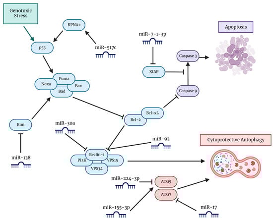 Frequently, miRNA targets are chosen following quantitative polymerase chain reaction (qPCR), miRNA microarray, or bioinformatics-driven analysis where correlations are drawn between levels of a particular miRNA and either improved or worsened prognosis for GBM patients. An example is miR-517c, a member of the C19MC RNA cluster that has been shown to be positively correlated with improved prognosis in GBM patients []. The proposed mechanism of action is the miR-517c/karyopherin alpha 2 (KPNA2, RAG cohort 1, or importin alpha 1)/cytoplasmic p53 axis, where miR-517c degrades KPNA2, negatively impacting the nuclear translocation of p53, leading to the inhibition of autophagy in U87MG cells harboring wild-type p53. In the context of combination treatment with TMZ, inhibition of autophagy by miR-517c was correlated with reduced migration and infiltration, as well as an increased expression of epithelial markers and inhibition of endothelial-to-mesenchymal transition (EMT) [].