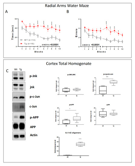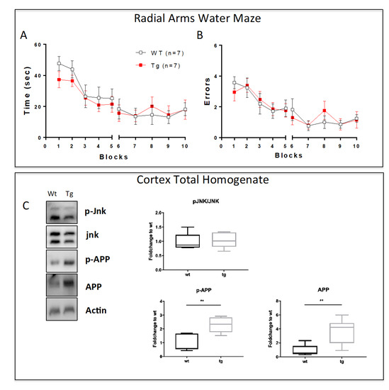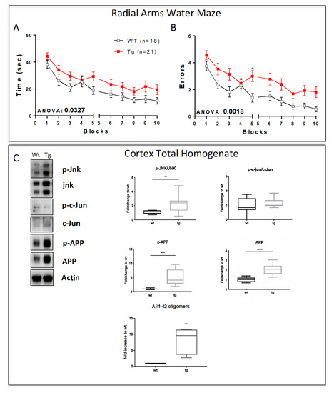 We next analyzed mice at 10 months of age, and 5xFAD mice failed to learn the platform location over 2 days of testing, displaying an almost flat learning curve, and were significantly impaired compared to the non-transgenic mice (ANOVA for time, p < 0.0001, and for errors, p < 0.0001; Figure 4A,B). These results demonstrated an important worsening of cognitive and mnemonic abilities in 5xFAD animals compared to wt mice, confirming this as the latest phase of the pathology. When we looked at the cortex lysates, no JNK activation was found in tg compared to wt mice, while the p-c-Jun/c-Jun ratio was sharply increased (p < 0.001, Figure 4C), indicating the activation of the neuronal death program. Our data also showed increased p-APP levels (p < 0.05, Figure 4C) without any differences in APP expression in 5xFAD vs. wt mice. However, we observed sharply increased Aβ1-42 levels (p < 0.0001, Figure 4C) in 5xFAD mice, reinforcing the correlation between the progression of the disease and the cognitive impairments.