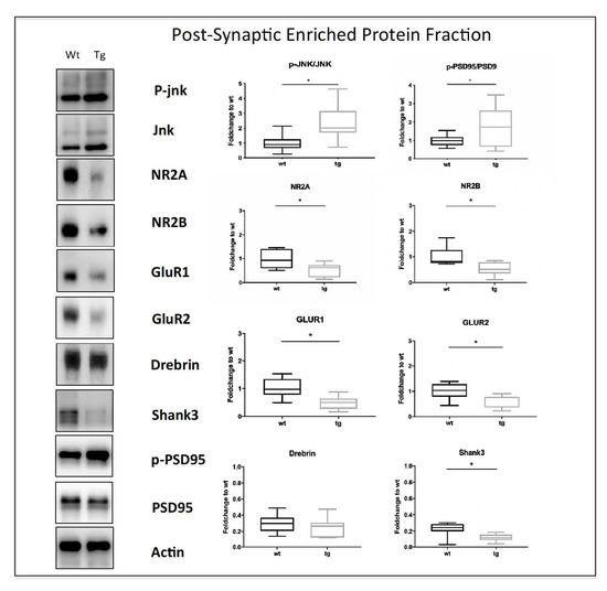 Protein concentrations were quantified using the Bradford Assay (5000006, Bio-Rad Protein Assay, Hercules, CA, USA): 10 μg of total homogenate and 5 μg of TIF extracted proteins were separated by 10% SDS polyacrylamide gel electrophoresis. PVDF membranes (1620177, Bio-Rad, Hercules, CA, USA) were blocked in Tris-buffered saline 5% non-fat milk powder (70166, Sigma-Aldrich, Darmstadt, Germany), and 0.1% Tween 20 (P1379, Sigma-Aldrich, Darmstadt, Germany) (1 h, RT). Primary antibodies were diluted in the same buffer (incubation overnight, 4 °C) using anti-P-JNKs (1:1000, BK9251S, Cell Signalling, Danvers, MA, USA); anti-JNKs (1:1000 BK9252S, Cell Signalling, Danvers, MA, USA); anti p-APP (1:1000, Cell signaling); anti-APP (1:1000, VC298620, Invitrogen, Waltham, MA, USA); anti-p-c-Jun (1:1000, 06-659, Millipore, Bedford, MA, USA); anti-c-Jun (1:1000, BK9165S, Cell Signalling, Danvers, MA, USA); anti-NMDA Receptor 2A GluN2A (1:2000, BK4205S, Cell Signalling, Danvers, MA, USA); anti-NMDA Receptor 2B GluN2B (1:2000, BK14544S, Cell Signalling, Danvers, MA, USA); anti-Glutamate Receptor 1 (AMPA subtype) GluA1 (1:1000, BK13185S Millipore, Bedford, MA, USA); anti-Glutamate Receptor 2 (AMPA subtype) GluA2 (1:1000, MAB397 Millipore, Bedford, MA, USA); anti-post-synaptic density protein 95 (PSD95) (1:2000, CAY-10011435-100, Cayman Chemical Company, Ann Arbor, MI, USA); anti PSD95 (1:1000, AB2930, Abcam, Cambridge, UK); anti-Drebrin (1:1000, BSR-M05530, Boster, Pleasanton, CA, USA); anti-Shank3 (1:1000, 64555, Cell Signalling, Danvers, MA, USA); anti-Actin (1:5000, MAB1501, Millipore, Bedford, MA, USA). Blots were developed using horseradish-peroxidase-conjugated secondary antibodies (Santa Cruz Biotechnology, Dallas, TX, USA) and the ECL chemiluminescence system (Bio-Rad, Hercules, CA, USA). Western blots were quantified by densitometry using Quantity One software (Bio-Rad, Hercules, CA, USA). Experiments were performed at least three times.