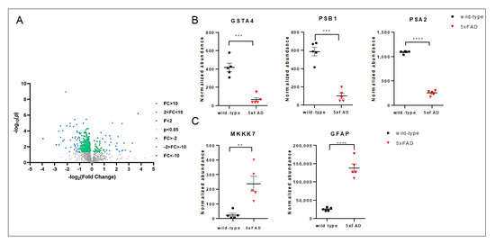 Mass spectrometry analysis of cortex lysates of 5xFAD and wt mice at 10 months of age. (A) Volcano plot illustrates significantly differentially abundant proteins. The −log10 (Benjamini–Hochberg corrected p value) is plotted against the log2 (fold change: 5xFAD/wt). p = 0.05 is the significance threshold (prior to logarithmic transformation). (B) Significant decrease was observed in GSTA4, PSB1, PSA2 proteins in tg vs. control mice. (C) A significant increase in 10-month-old 5xFAD lysates was observed for GFAP and MKKK7 proteins. Genotypes are compared using t-tests. Statistical significance: ** p < 0.01, *** p < 0.001, **** p < 0.0001. Data are expressed as mean ± SEM.