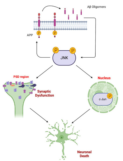 JNK role in AD pathogenesis. Stress stimuli (such as Aβ oligomers) induce JNK hyper-activation that acts in distinct cell compartments. Active JNK phosphorylates APP, promoting its amyloidogenic cleavage and the formation of Aβ oligomers that, in turn, activate JNK. While AD synaptic dysfunction can be induced directly by Aβ oligomers by promoting the misfunctioning of glutamate receptors, JNK plays a role in the post-synaptic element by phosphorylating its targets (i.e., PSD95), perpetrating the neurodegenerative process. Additionally, activated JNK can also translocate in the nucleus, where it targets the elective substrate c-jun, thus triggering the neuronal death pathway.