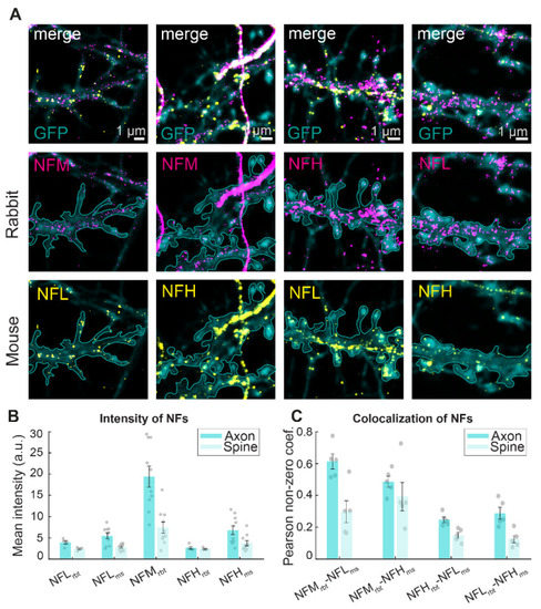 Distribution of NF signal in different neuronal compartments. (A) Representative STED images of NF isoforms (magenta for rabbit (rbt) and yellow for mouse (ms)) and confocal GFP volume labeling (cyan) in primary hippocampal neurons. Corresponding large fields of view images can be found in Figure S1. Cyan outline represents spine shapes on dendrites as determined by volume labeling. Scale bars are 1 µm. (B) Mean fluorescence intensity of the NF isoforms in axons and dendritic spines. (C) Colocalization analysis of NFs in axons and dendrites. Shown is the mean values of Pearson’s correlation coefficient of all pixels with non-zero intensities. Error bars show the standard error of the mean (SEM), points represent average values of individual images. Intensities and colocalization data calculated from 5 images per antibody pair from one neuronal culture (21–26 DIV). Number of spines: NFMrbt-NFLms = 171; NFMrbt-NFHms = 63; NFHrbt-NFLms = 148; NFLrbt-NFHms = 100.