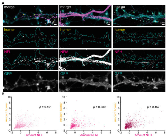 NFs belong to the most abundant proteins in neurons and are found in both axonal and dendritic regions. Although several studies suggest other NF functions beyond axonal structural support, and connections with psychiatric disorders are known, their role at the synapse is only beginning to emerge [13,14,15]. In the last decade, the presence of NF oligomers has been reported at postsynaptic sites, where they influence receptor function, LTP induction, and spine morphology [3,13]. In this work, we used quantitative multicolor nanoscopy of the NF triplet to characterize its distribution and identify correlations between its presence and synaptic traits. In particular, we analyzed the correlation between NFL, NFM, and NFH with either a marker of postsynaptic strength (homer) or a marker of presynaptic activity (Syt1) [25,26].