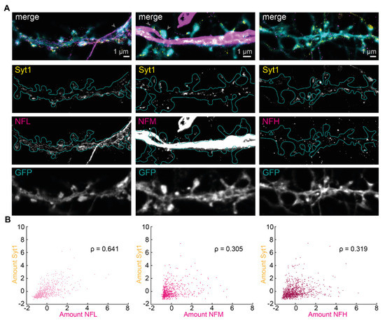To clarify the regulation of the NFs presence in postsynaptic compartments, we used quantitative multicolor super resolution stimulated emission depletion (STED) nanoscopy of the NF triplet NFL, NFM, or NFH in combination with proxies of either postsynaptic strength (homer) or of presynaptic activity (synaptotagmin-1, Syt1, live-cell uptake [25,26]) on cultured hippocampal neurons. We found that NFL is the most abundant isoform in dendritic spines. Overall, the amounts of NF isoforms correlated with both homer and Syt1 signal to varying extents, with NFL showing the highest and NFM the lowest correlation, suggesting that their occurrence might be influenced by the postsynaptic strength and activity.