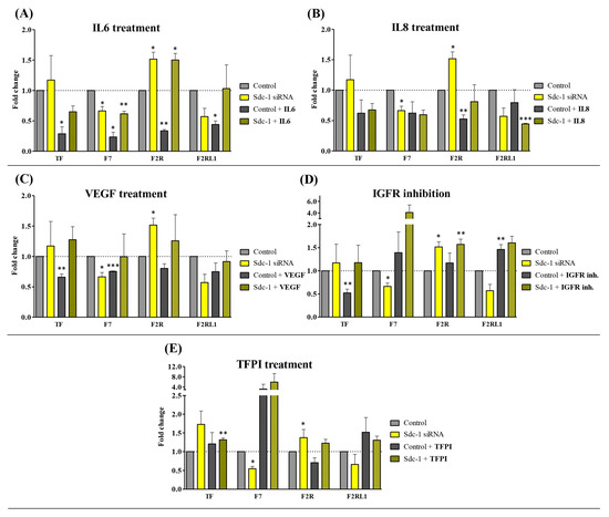 To study the impact of Sdc-1-KD on the TF pathway, we analyzed the mRNA expression of TF; coagulation factor VII (F7); coagulation factor II thrombin receptor (F2R), also known as protease-activated receptor (PAR)-1; and coagulation factor II (thrombin) receptor-like 1 (F2RL1), also known as PAR-2, by means of qPCR [11]. Seventy-two hours after Sdc-1 downregulation, significantly diminished F7 expression and significant upregulation in the expression of F2R were observed compared to control cells (Figure 1), whereas TF and F2RL1 were not affected. To characterize which molecular pathways may be involved in Sdc-1-dependent TF pathway constituent expression, we stimulated cells with exogenous IL6, IL8, or VEGF, or treated them with TFPI or IGFR inhibitors, respectively. Treatment of control MDA-MB-231 cells with IL6 resulted in significant downregulations of TF (0.28, p < 0.05), F7 (0.23, p < 0.05), F2R (0.33, p < 0.01), and F2RL1 (0.44, p < 0.05) (Figure 1A). Sdc-1-KD reversed this effect, leading to the upregulation of TF and F7 partially to control levels (F2RL1) or even exceeding these levels (F2R), suggesting that Sdc-1 is required for proper IL6 signaling in this context. With respect to IL8 treatment, only F2R was significantly downregulated in control cells. This effect could be abolished by Sdc-1-KD (Figure 1B). Sdc-1-dependent downregulation of F2RL1 expression was further enhanced by IL8 treatment, suggesting complex regulatory interactions (Figure 1B). Treatment of MDA-MB-231 cells with VEGF resulted in a significant downregulation of TF (0.65, p < 0.01) and F7 (0.75, p < 0.01), which was reversed by Sdc-1-KD, which is again compatible with a potential role as a signaling coreceptor (Figure 1C). IGFR inhibition resulted in the downregulation of TF and the upregulation of F2RL1 (1.46, p < 0.01) in control cells, which was abolished by Sdc-1-KD in the case of TF (Figure 1D). The application of TFPI only resulted in a slight upregulation of TF in Sdc-1-depleted cells (Figure 1E). Overall, these data suggest that cytokine-dependent regulation of the TF pathway in MDA-MB-231 cells is partially dependent on the presence of Sdc-1.