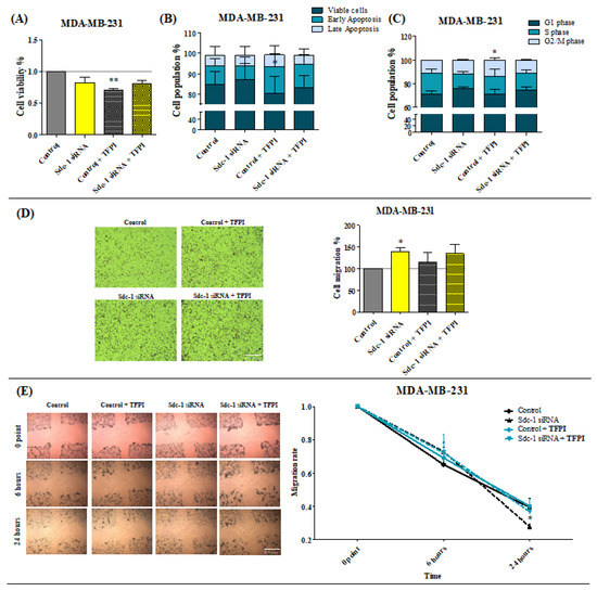 Treatment with TFPI decreases the viability and invasive phenotype of MDA-MB-231 cells. (A) The MTT assay revealed a significant effect of TFPI treatment on cell viability (n = 3). (B) Early apoptotic MDA-MB-231 cells were found to be increased with respect to TFPI (50 μg/mL) treatment. Apoptosis was determined after Sdc-1-depletion (24 h) and 48 h after 50 μg/mL of TFPI treatment with annexin V and PI staining and by means of flow cytometry, and the percentage of viable (annexin V−/PI−), early apoptotic (annexin V+/PI−), and late apoptotic (annexin V+/PI+) cells are plotted as a percentage of the cell population (n = 3, MDA-MB-231). (C) TFPI treatment promotes cell cycle progression in MDA-MB-231 cells. Cell cycle phase composition was measured by means of DAPI staining and flow cytometry after Sdc-1-depletion and 48 hours of 50 μg/mL TFPI treatment (n = 3, MDA-MB-231). (D,E) Sdc-1-KD increased the migratory characteristics of MDA-MB-231 cells, as determined using transwell migration and wound-healing (scratch) assays. The left panel shows representative images of both assays (10× magnification) and the right panel shows the percentage of cell migration for the migration assay and the rate of migration for the scratch assay. Scale bars = 100 μm. Data represent mean ± SEM. Asterisks on the top of the bars indicate significant differences between the control and all the conditions. Lines over the bars indicate significant differences (* p < 0.05, ** p < 0.01).