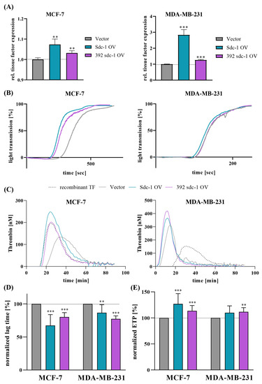 To complement our studies on Sdc1-depleted cells, we stably transfected MCF-7 and MDA-MB-231 cells with two different Sdc-1 DNA constructs and a control vector in order to better understand the functions of the wild-type (Sdc-1-OV) and soluble Sdc-1 ectodomain (392-Sdc-1-OV) in the modulation of the TF pathway (Figure 4B,C). Highly homologous murine constructs were used [5] and Sdc-1 overexpression was confirmed using qPCR (Figure S1F).