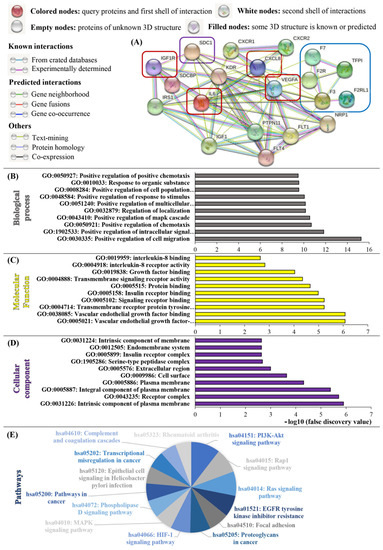 STRING analysis, revealing interactions between Sdc-1, the TF pathway, and cancer-related processes. Using the STRING database (http://string-db.org/ (accessed on 1 September 2022)), the protein–protein interaction network of Sdc-1 and TF pathway-related genes with respect to IL6, IL8, VEGF, and IGF-1R was determined via STRING analysis. (A) Interaction network of Sdc-1 (violet box), TF-pathway-related genes (TF, F7, F2R, F2RL1, and TFPI) (blue box) and IL6, IL8, VEGF, and IGF-1R (red boxes). Gene ontology (GO) analysis: (B) KEGG pathway analysis, (C) biological process, (D) molecular function, and (E) cellular components. The graphs for biological process (gray), molecular functions (yellow), and cellular components (violet), and the pie chart for KEGG pathways revealed the ten most significant GO keywords (p < 0.05). The log10 transformation was used to present the top 10 values. Tables S4–S6 contain further information.