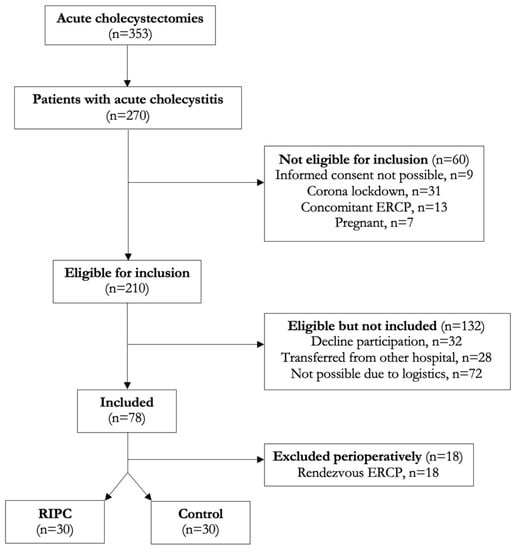 Sixty patients undergoing surgery due to acute cholecystitis were included in this study during a 24-month period. The details on the patient flow are illustrated in Figure 1. A total of 210 patients admitted with acute cholecystitis met the inclusion criteria. However, 132 patients either declined to participate, relocated from other hospitals, or had surgery shortly after diagnosis, which was incompatible with inclusion and intervention. Hence, 78 patients were enrolled in the study and 18 were excluded immediately after surgery as perioperative endoscopic retrograde cholangiopancreatography was performed due to choledocholithiasis (an exclusion criteria). A such, 60 patients randomly allocated to either a RIPC group (n = 30) or a control group (n = 30) were analysed.