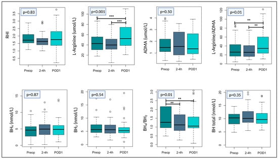 Changes of endothelial function and markers of NO bioavailability in patients undergoing surgery. Boxplots illustrating changes of reactive hyperaemia index (RHI) and plasma concentrations of L-arginine, asymmetric dimethylarginine (ADMA), L-arginine/ADMA-ratio, tetrahydrobiopterin (BH4), dihydrobiopterin (BH2), BH4/BH2-ratio, and total biopterin in relation to surgery. Box plots show median with variance with lower and upper hinges representing the 25th and 75th percentile, respectively. White circles represent measurements below or above the 25th and 75th percentile. Preop = preoperative; 2–4 h = two–four hours after surgery; POD1 = 24 h after surgery. p-values are given for the overall changes in time. *** p < 0.001 ** p < 0.05. Created with R studio and www.BioRender.com (accessed on 20 February 2023).