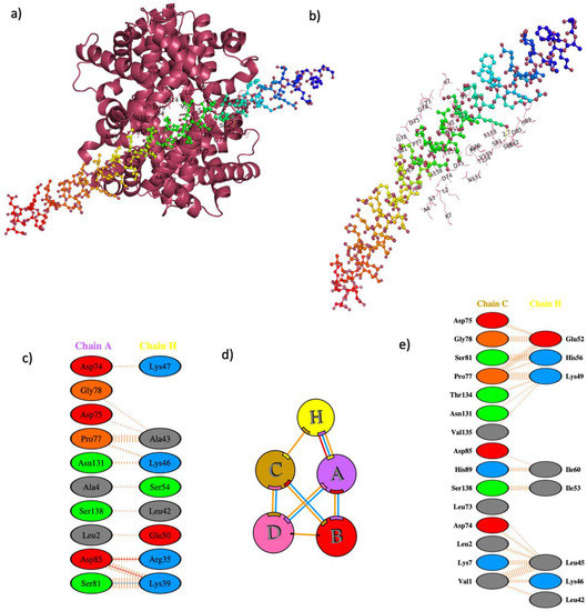Molecular docking of IF1 and tetrameric haemoglobin, and a visualisation of interacting residues. (a) Docking of tetrameric haemoglobin (red) with a single chain of IF1; (b) the interacting residues of IF1 in haemoglobin docking simulation; (c) schematic representation of interacting residues between haemoglobin chain A and IF1 chain; (d) positioning of IF1 in proximity to interacting haemoglobin chains A and C, where different coloured lines represent different interactions between amino acids, specifically: red—salt bridges, yellow—disulphide bonds, blue—hydrogen bonds, and orange—non-bonded contacts; (e) schematic representation of the interacting residues between haemoglobin chain C and IF1 chain.