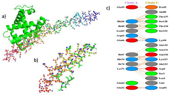 Molecular docking of IF1 and monomeric haemoglobin alpha, and a visualisation of interacting residues. (a) Docking of monomeric haemoglobin alpha (green) with a single chain of IF1; (b) the monomeric haemoglobin alpha interaction site of IF1 chain; (c) schematic representation of the interacting residues between monomeric haemoglobin alpha and IF1 chain.