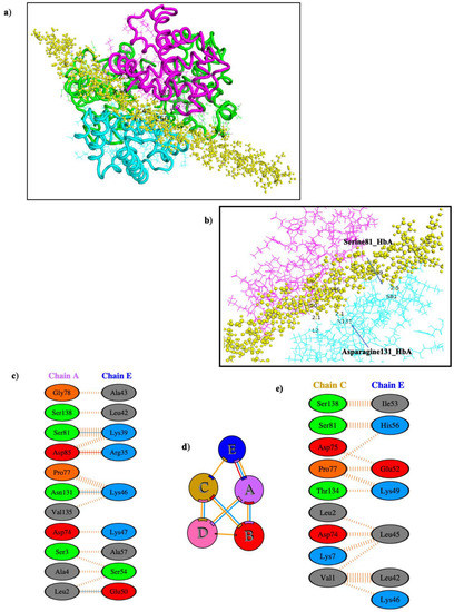 Haemoglobin–IF1 association after 8 ns MD simulation. (a) IF1 docked in the cleft of two alpha chains of haemoglobin (pink—Chain A, light blue—Chain C, yellow—IF1). (b) Shows interaction of haemoglobin residues with IF1 residues—Serine 84 and Asparagine 131 of HbA. Interacting residues. (c) Schematic representation of interacting residues between tetrameric haemoglobin chain A and IF1 after 8 ns MD simulation. (d) Positioning of IF1 in proximity to interacting haemoglobin chains A and C after 8 ns MD simulation, where different coloured lines represent different interactions between amino acids, specifically: red—salt bridges, yellow—disulphide bonds, blue—hydrogen bonds, and orange—non-bonded contacts. (e) Schematic representation of interacting residues between tetrameric haemoglobin chain C and IF1 after 8 ns MD simulation.