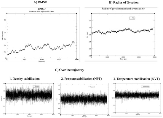 Quantitative quality check for the MD run. (A) Root-mean-square deviation (RMSD); (B) radius of gyration shows a reasonable invariant Rg values across the MD run of 8 ns, indicating the protein remains very stable; (C) the thermodynamic factors of density, pressure, and temperature are stable across the MD run.