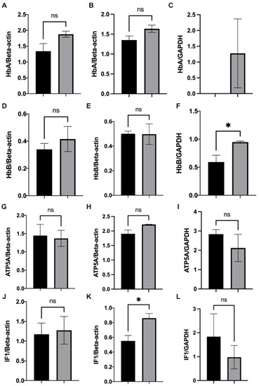 Relative mitochondrial protein expression in normoxic (black) and hypoxic (grey) (A,D,G,J) rat liver,(B,E,H,K) mouse liver, and (C,F,I,L) mouse quadriceps muscle. (A–C) haemoglobin α; (D–F) haemoglobin β; (G–I) ATP5A; (J–L) IF1. Liver mitochondria protein expression normalised to β-actin and quadriceps muscle mitochondria protein expression normalised to GAPDH (see Supplementary Figure S4). Data presented as mean with SEM, * p < 0.05, N = 3, Student’s unpaired t-test.
