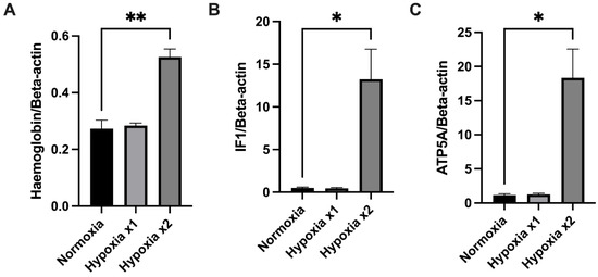 Relative expression of mitochondrial proteins in normoxic and hypoxic D. melanogaster. (A) haemoglobin; (B) IF1; (C) ATP5A. Protein expression normalised to β-actin (see Supplementary Figure S5). Data are presented as mean with SEM, * p < 0.05, ** p < 0.005 N = 3, Student’s unpaired t-test.