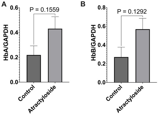 Atractyloside-treated HEPG2 cells show a trend toward increased expression of mitochondrial haemoglobin. (A) Relative expression of haemoglobin α in mitochondria isolated from atractyloside-treated HEPG2 cells. (B) Relative expression of haemoglobin β in mitochondria isolated from atractyloside-treated HEPG2 cells. Data are presented as mean with SEM, N = 3, student’s unpaired t-test.