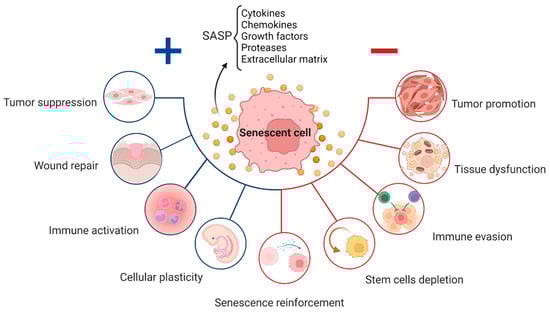 However, it is now well known that cellular senescence is responsible for the development and progression of a wide range of major age-related diseases. Long-term accumulation of senescent cells has been associated with neurological and metabolic diseases, cancer, cardiovascular dysfunction, skin, bone, and liver problems, and infections [83]. Although senescent cells are usually cleared by the immune system, considerable numbers of these cells are consistently found in affected areas. The detrimental effects of senescent cells spread to the surrounding tissue environment through a variety of mechanisms, the majority of which are triggered by SASP secretome-associated signals, including homeostatic abnormalities, chronic inflammatory responses, stem cell niche suppression, fibrosis, angiogenesis, induction of epithelial–mesenchymal transition, and cancer cell survival and proliferation conditions [5].