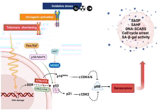 Telomeres are composed of TTAGGG sequence repeats at the ends of chromosomes, which preserve the genetic material. The length of the non-replicated DNA molecules decreases with each cell division. Thus, in highly proliferating tissues or in telomere syndromes, progerias, and premature aging, which include hereditary diseases linked to early senescence, the telomeres are shortening much more quickly [53]. Telomere attrition is often considered to be a DNA damage and a DNA damage response (or DDR) [54] occurring after approximately 60–70 cell divisions for embryonic fibroblasts [48] (Figure 2). Ataxia telangiectasia mutated (ATM), ataxia telangiectasia, and Rad3-related (ATR) are the first checkpoint kinases that become active in response to DNA damage [55]. Subsequently, these kinases cause the activation of various proteins, including checkpoint kinase 2 (Chk2). ATM phosphorylation fully activates Chk2 after triggering oligomerization and autophosphorylation of Chk2, which in turn transmits DNA damage signaling to several components involved in cell cycle arrest, apoptosis, and DNA repair, including phosphorylation and activation of the tumor suppressor protein p53, which initiates p21 expression [5,56,57]. P21 inhibits cyclin-dependent kinase 2 (CDK2), which prevents the phosphorylation of the retinoblastoma protein (Rb). As a result, transcription of the proteins needed for the subsequent cell cycle stage (S Phase) is prevented, resulting in cell cycle arrest at the G1 phase [5,57]. Along with the Chk2-p53-dependent regulation of p21, cancer cells implement a p53-independent mechanism involving retrovirus-mediated expression of Chk2 kinase to transcribe p21 without requiring p53 protein [56]. Moreover, consistent steps occur for human diploid cells that have gone through RS, where in the later passages, when cells lose their ability to proliferate and become senescent, p21 protein expression first rises. Later, the levels of p21 drop as those of p16 mRNA and ultimately its p16 protein steadily rise. The protein p16, also known as cyclin-dependent kinase inhibitor 2A, or CDKN2A, slows down cell division by delaying the transition from the G1 phase to the S phase of the cell cycle. This protein, with CDK4 and CDK6 kinases, form a complex that blocks the phosphorylation of Rb, making p16 a final key factor in stabilizing senescence, which is the main reason why cancer cells frequently have mutations in p16 rather than in p21 [58]. Because senescence is a permanent cell cycle arrest in G1 phase, it must be permanently maintained either by the previously described DDR, which can be prolonged or permanent [59], or by the development of senescence-associated heterochromatin foci (SAHFs), which prevent transcription of E2F-regulated target genes required for cell proliferation. However, senescence can also be observed in the absence of SAHFs, for example in cells that have become senescent following loss of PTEN or activation of protein kinase B (AKT), or in murine cells that do not develop robust SAHFs [60,61].